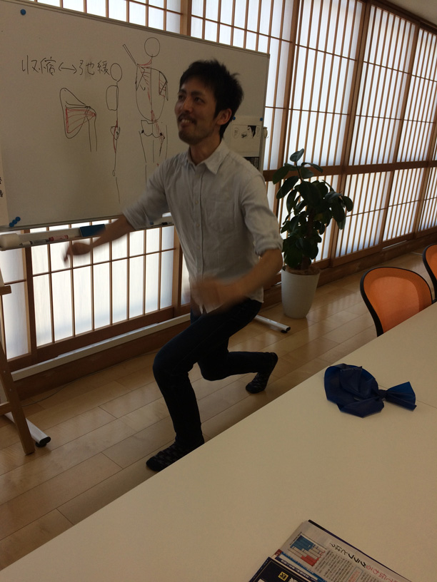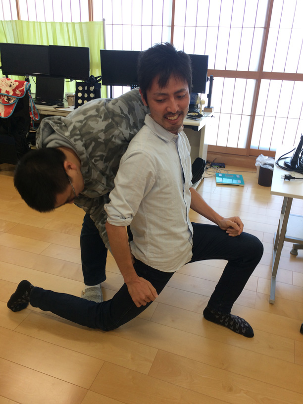 脚を前後に広げ、背筋伸ばしながら落としていきます。